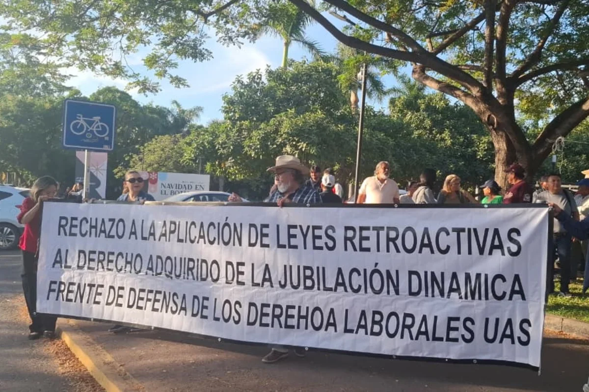Culiacán, Sinaloa.- La mañana de este viernes 28 de noviembre, jubilados académicos y administrativos de la Universidad Autónoma de Sinaloa (UAS) se manifestaron en Culiacán en rechazo a la reingeniería financiera y exigieron que se realice una auditoría externa de los recursos propios de la institución.