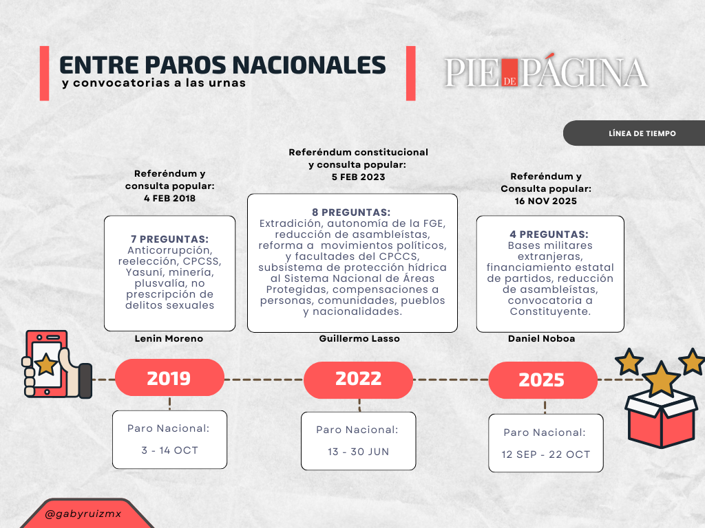 A través de la revisión histórica de los tres paros y el llamado a las urnas para consulta, Ecuador evidencia una disminución progresiva de temas en las consultas para garantizar derechos sociales o colectivos para dar paso al predominio de la seguridad y reorganización del poder político.