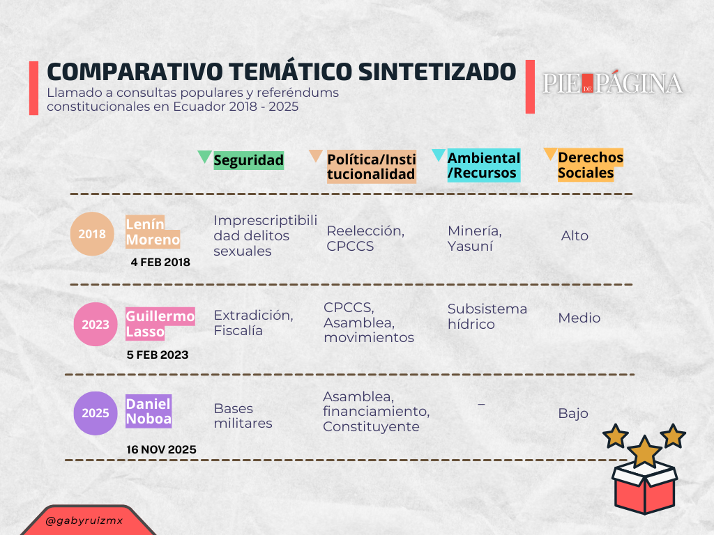 A lo largo de los tres procesos consultivos nacionales de Ecuador —febrero de 2018, febrero de 2023 y noviembre de 2025—, las preguntas giraron en torno a la institucionalidad (CPCCS, reelección, reducción de legisladores, financiamiento de partidos, Constituyente) y seguridad/geopolítica (extradición, bases militares). Pocas o ninguna pregunta proponía medidas concretas de política social (salud pública, educación, redistribución, empleo). Esto prueba que la agenda plebiscitaria priorizó reglas del juego por sobre soluciones sociales.