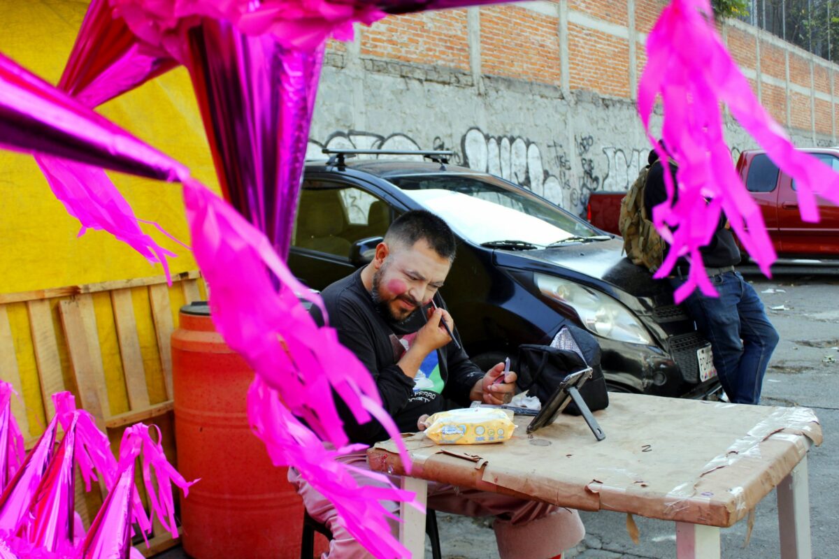 Entre los silbidos de los típicos “viene, viene” y el contraste vibrante de las piñatas rosas, monta su camerino efímero en una pequeña mesa de madera con un espejo y su maquillaje al frente.