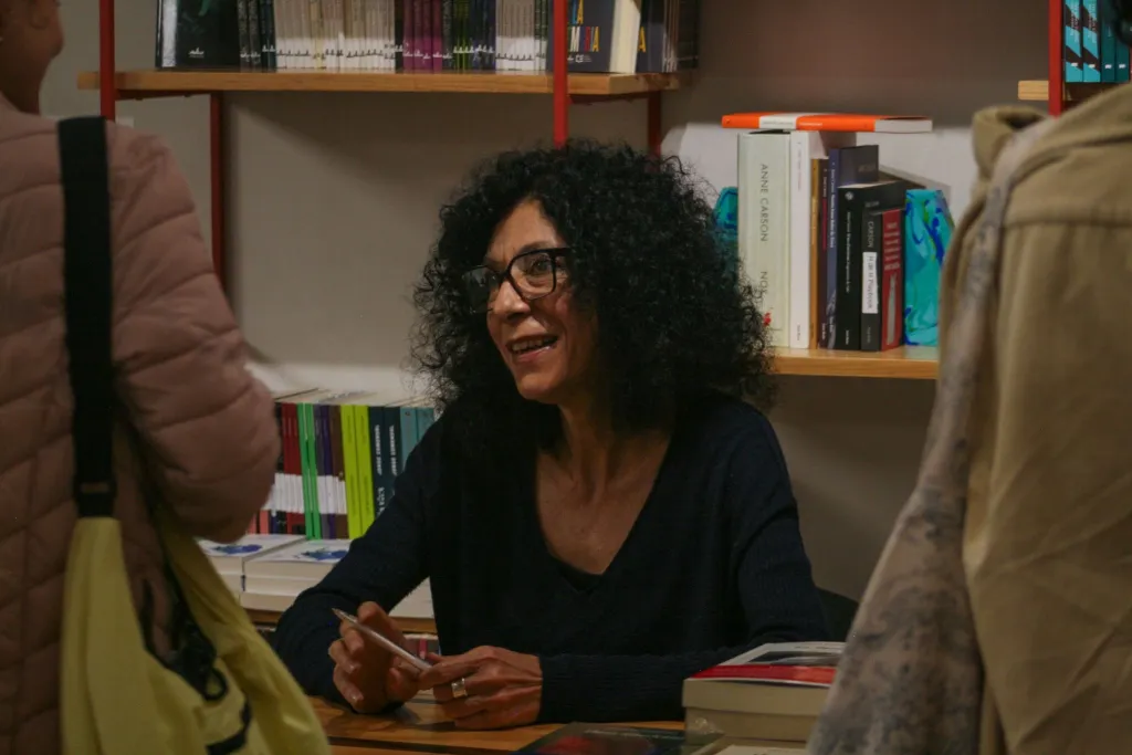 Leila firma libros de sus lectores en la librería Casa Tomada, al día siguiente de su presentación en CASUL. Foto: Julián Peralta.