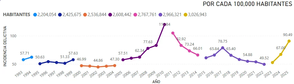 Según los datos oficiales, en promedio diario, en 2025 se cometieron 35% más delitos de alto impacto que en 2024, es decir, 7.5 delitos denunciados cada día. La tasa por cada 100 mil habitantes es del 90.49, una cifra que solo fue superada en 2010 con una tasa de 119.84 por cada 100 mil habitantes.