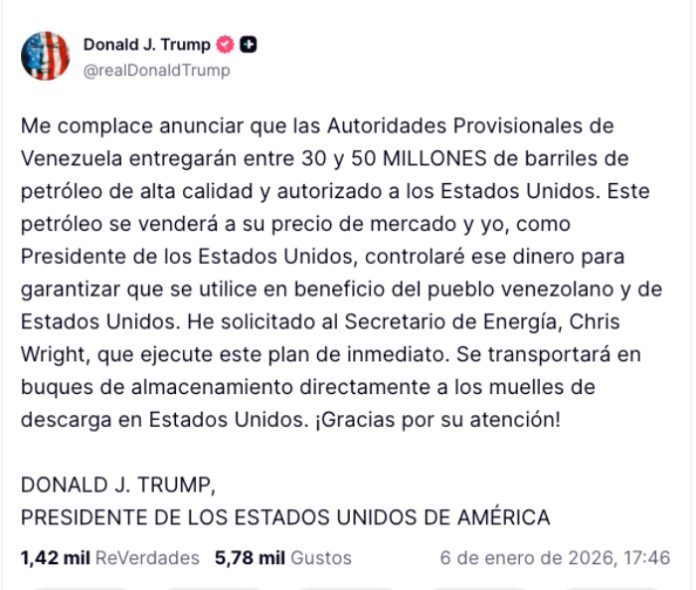 “Este petróleo se venderá a su precio de mercado y yo, como Presidente de los Estados Unidos, controlaré ese dinero para garantizar que se utilice en beneficio del pueblo venezolano y de Estados Unidos”, anunció en su cuenta de TruthSocial.