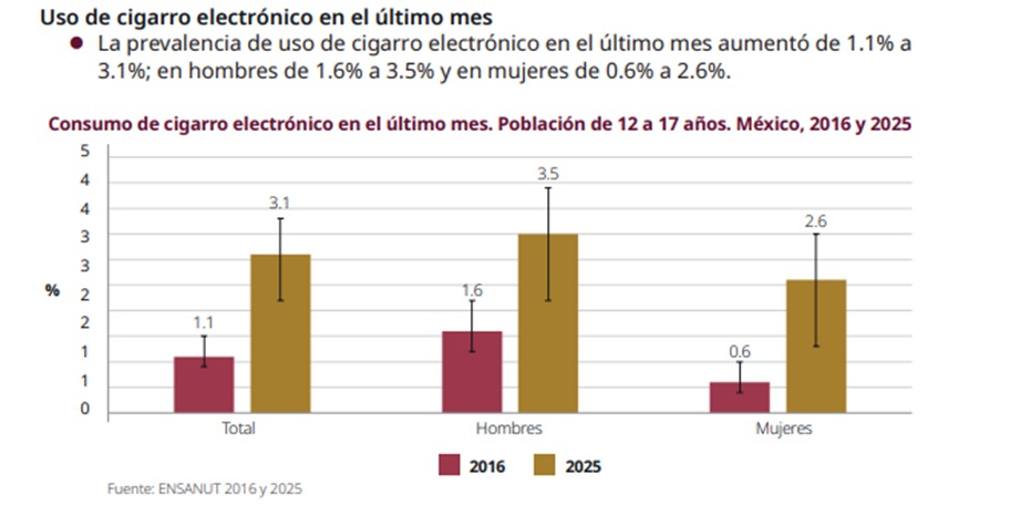 En adolescentes, el vapeo casi se triplicó, consolidándose como una nueva puerta de entrada al consumo de nicotina, especialmente entre mujeres jóvenes, en gran medida debido a la percepción errónea de que se trata de una alternativa menos dañina.
