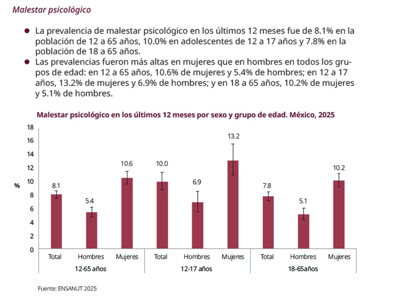 Uno de los aportes más relevantes de la ENCODAT 2025 es la incorporación de un análisis amplio sobre salud mental. Los resultados muestran que los adolescentes concentran los niveles más altos de malestar psicológico, así como mayores prevalencias de ideación e intentos suicidas y de exposición a violencia física, emocional o sexual.