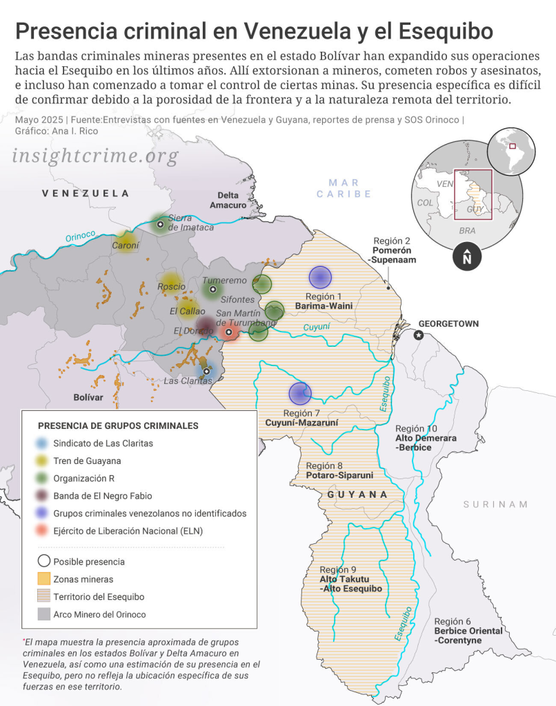 El Sindicato de Las Claritas, al igual que otras bandas mineras, también forma parte del entramado de actores involucrados en la disputa entre Venezuela y Guyana por la región del Esequibo, que limita con Bolívar. Por ello, es probable que el gobierno de Rodríguez opte por trabajar con estos grupos antes que enfrentarlos directamente.