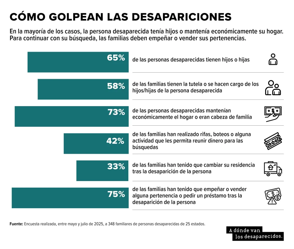 Cuando desaparece la persona proveedora, los gastos en alimentos, renta, servicios, educación y salud continúan, y son los familiares quienes tienen que cubrirlos, junto con los costos de transporte y de materiales para las jornadas de búsqueda e identificación.
