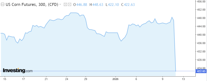 De 447.75 USX por unidad, cayó a 428.2 en cuestión de 5 minutos. Esta es la peor caída del precio internacional del maíz desde septiembre de 2024, y cayó al nivel más bajo desde noviembre del año pasado.