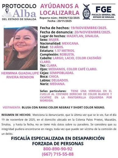 Mazatlán, Sin.- La Fiscalía General de la República (FGR) atrajo el caso de la desaparición de Guadalupe Herminia Rivera Rendón, ocurrida el pasado 19 de noviembre de 2025 en el estacionamiento de una plaza comercial ubicada en la colonia Palos Prietos, en Mazatlán.