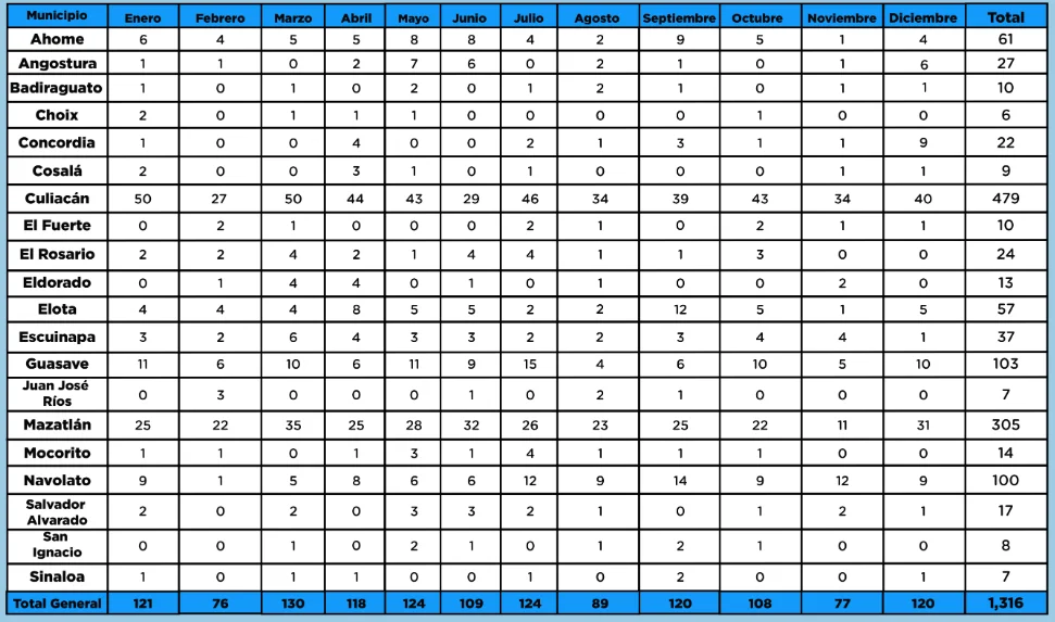 De acuerdo con información oficial de la Fiscalía General del Estado (FGE) de Sinaloa, del 1 de enero al 28 de diciembre de 2025, se abrieron mil 316 carpetas de investigación por el delito de privación de la libertad personal, siendo marzo el mes con más reportes, con 130 desapariciones.