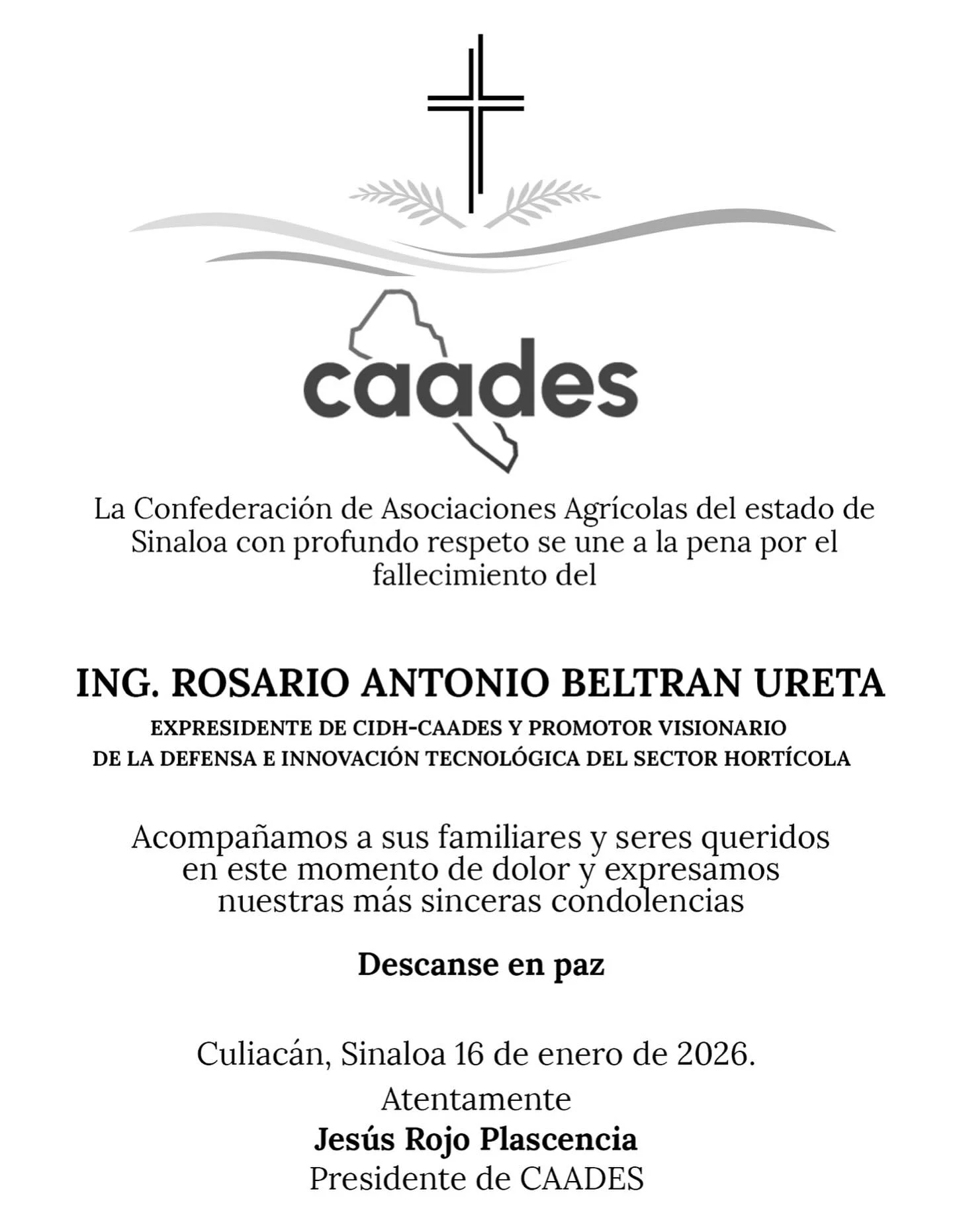 Navolato, Sin.- Durante la mañana de este 17 de enero, el presidente de la Comisión para la Investigación y Defensa de las Hortalizas de Sinaloa (CIDH), Mario Haroldo Robles, informó sobre el fallecimiento del ingeniero Rosario Antonio Beltrán Ureta, mejor conocido como “Tolín”, quien se destacó como agricultor y defensor del campo y de los derechos de las y los trabajadores agrícolas. El deceso ocurrió durante la tarde del 16 de enero.