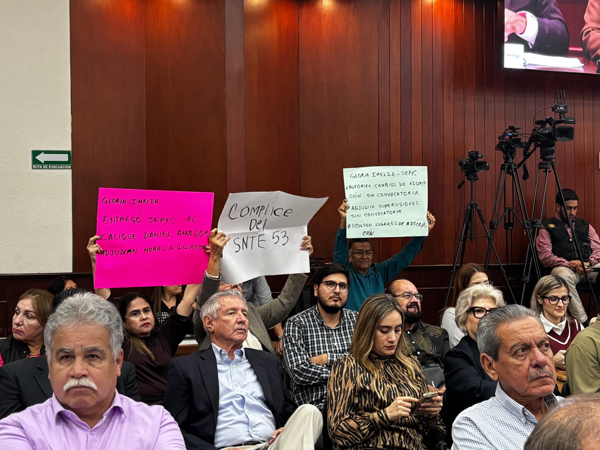 Durante la comparecencia, trabajadores de la educación se manifestaron de manera pacífica en el recinto legislativo. La protesta estuvo motivada por señalamientos de presuntos cambios de adscripción en supervisiones sin convocatoria, así como por la asignación discrecional de horas.
