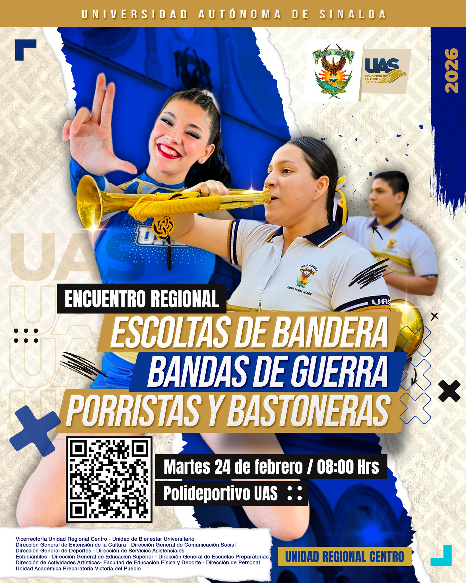 La Universidad Autónoma de Sinaloa (UAS), con el respaldo e instrucción del Rector, doctor Jesús Madueña Molina, y el apoyo de las Vicerrectorías y de Bienestar Universitario, a través de la Dirección General de Extensión de la Cultura lanzó la convocatoria para el Encuentro Regional 2026 de Escoltas de Bandera, Bandas de Guerra, Porristas y Bastoneras, un evento que busca celebrar el talento, la disciplina, la identidad y el amor a los símbolos patrios.