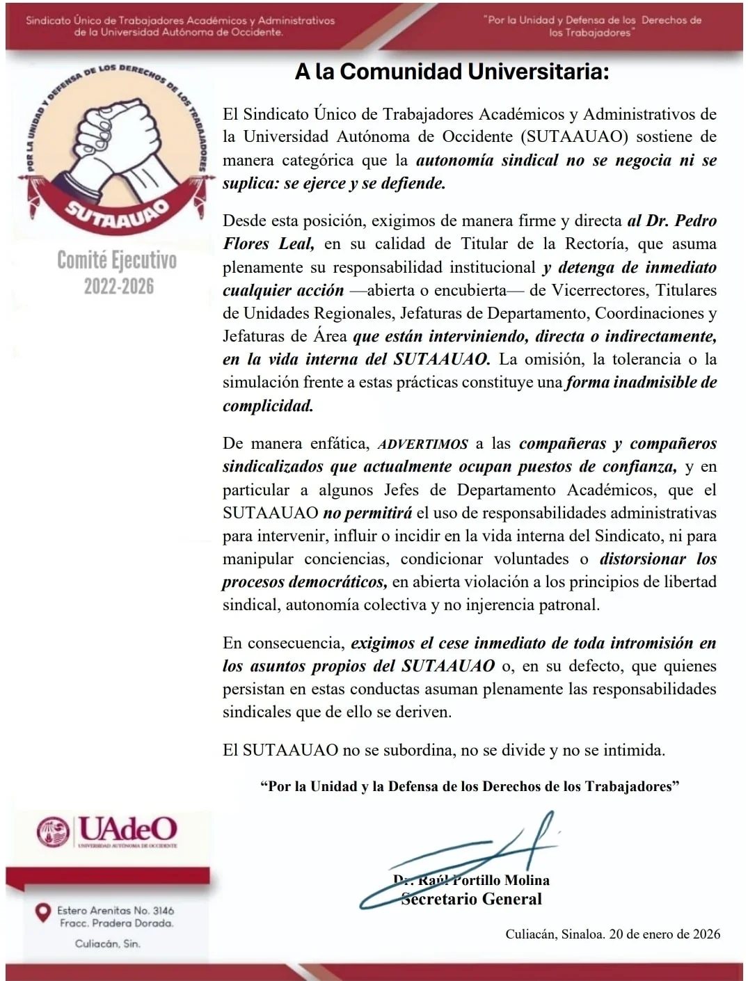 Culiacán, Sinaloa.- El Sindicato único de Trabajadores Académicos y Administrativos de la Universidad Autónoma de Occidente (SUTAAUAO) denunció presuntas intromisiones de autoridades universitarias en el proceso de elección sindical que dará comienzo en los próximos días.