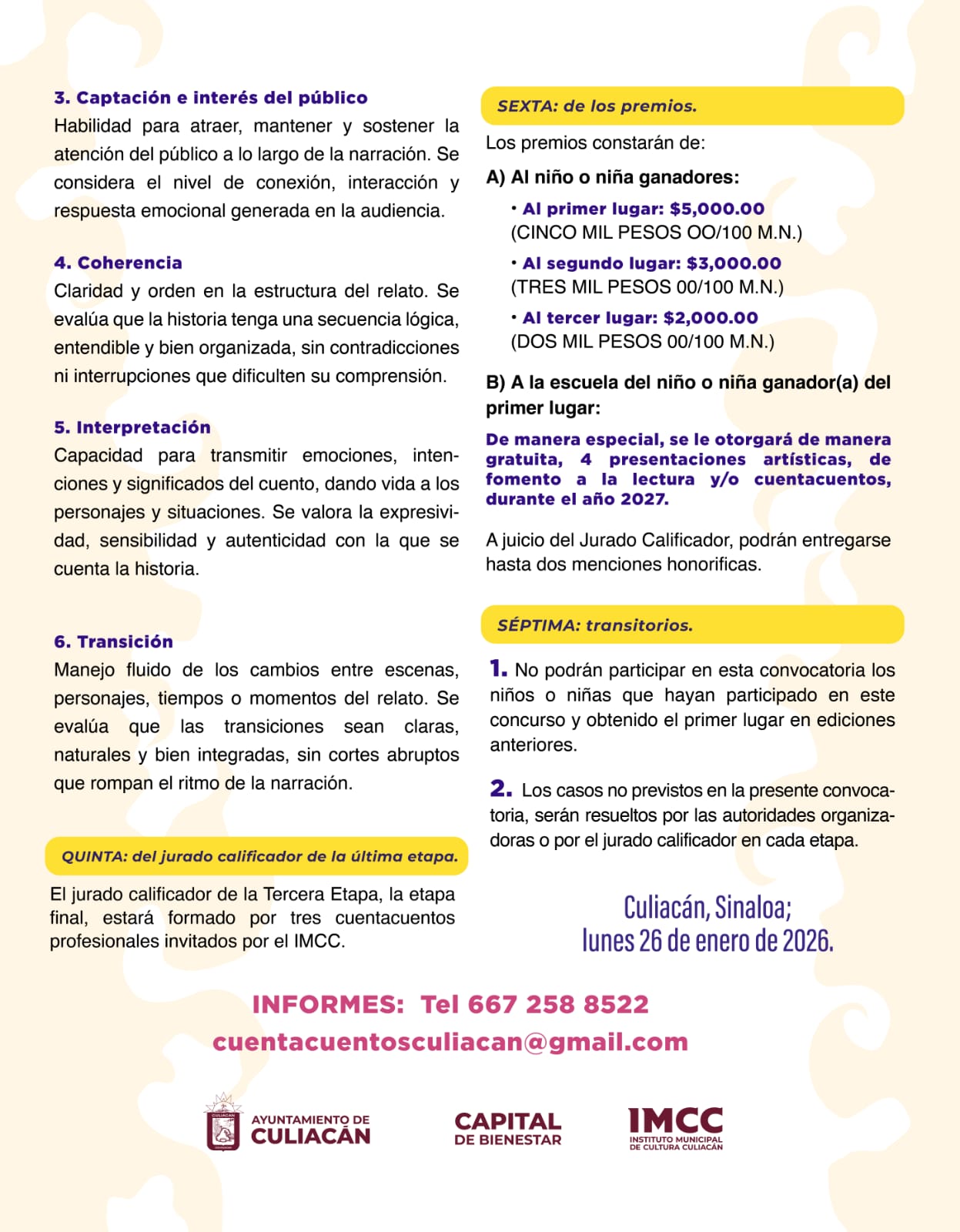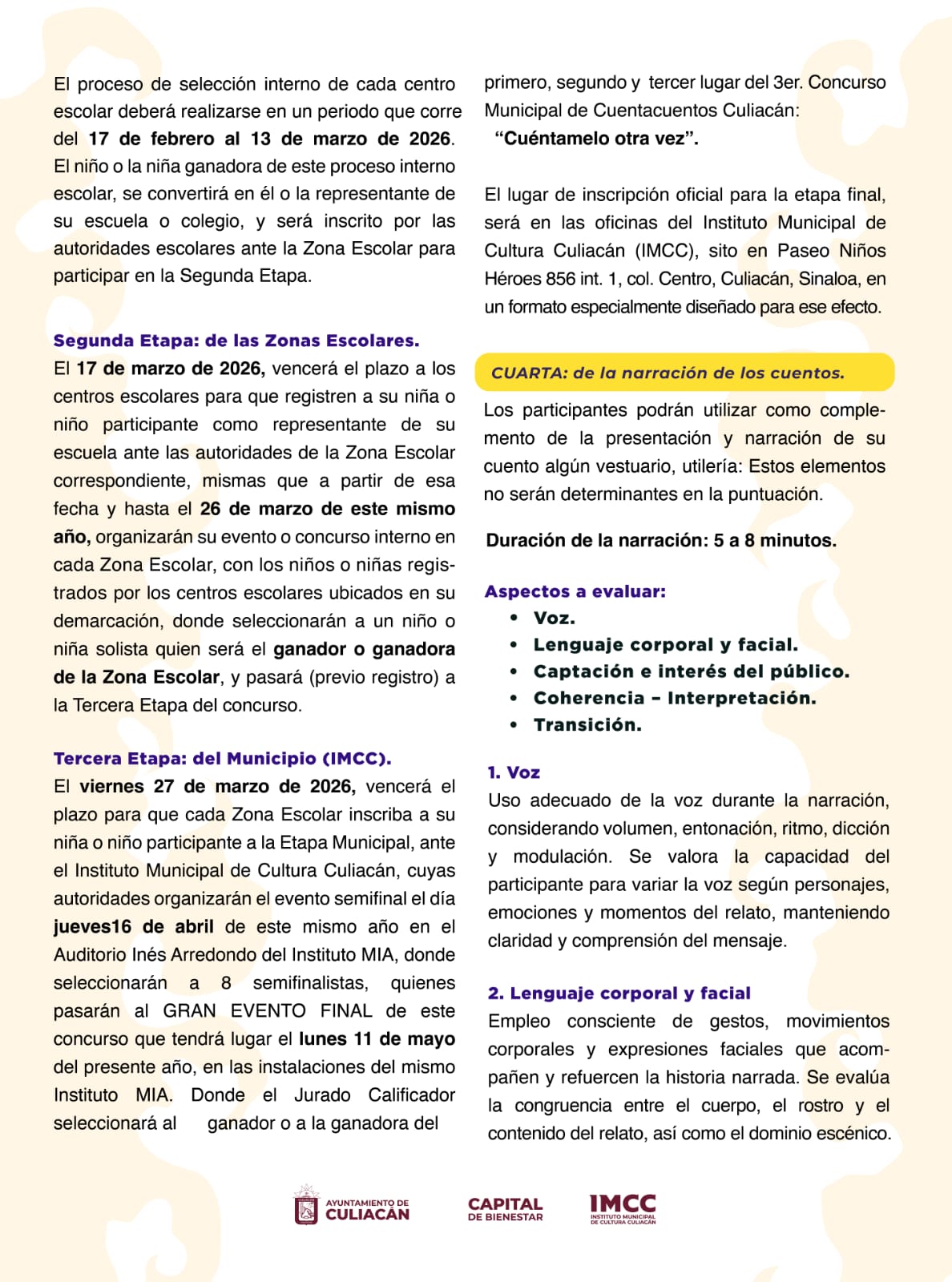 Culiacán, Sin.– El Ayuntamiento de Culiacán, a través del Instituto Municipal de Cultura Culiacán y la Dirección de Educación Municipal, lanzó la convocatoria para participar en el 3er Concurso Municipal de Cuentacuentos Culiacán 2026 “Cuéntamelo otra vez”, dirigido a niñas y niños que cursan cuarto, quinto y sexto grado de primaria en escuelas del municipio.
