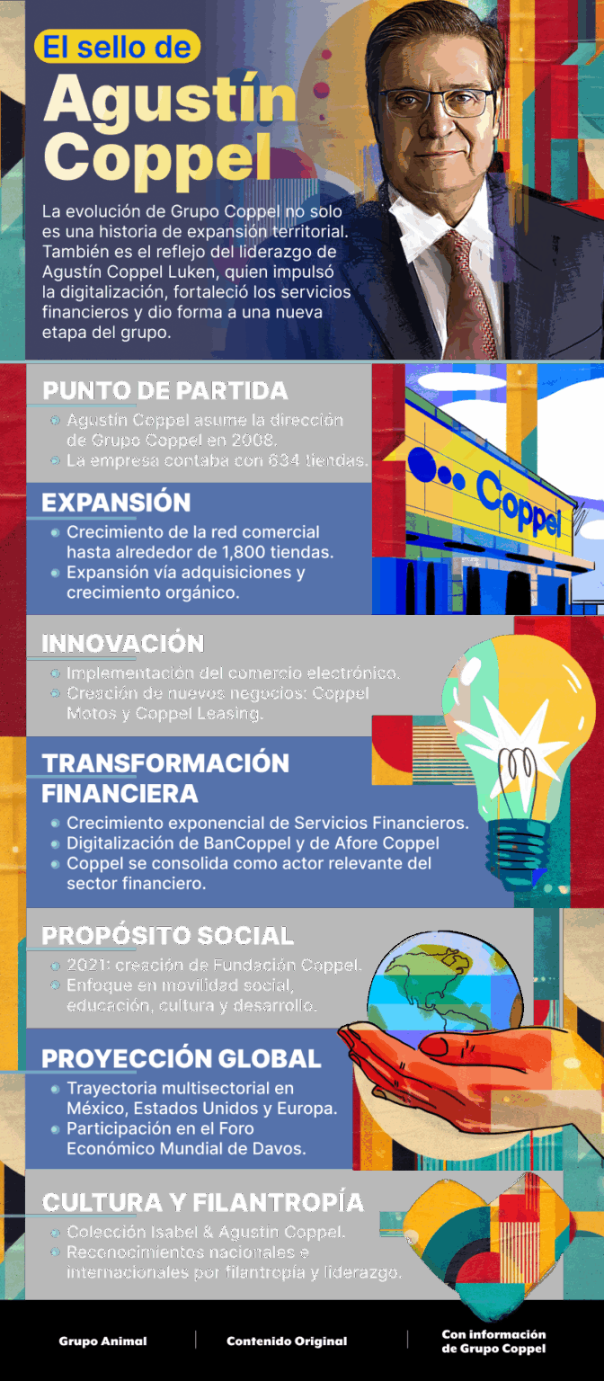 Hablar del crecimiento de Grupo Coppel es hablar directamente de Agustín Coppel Luken. Desde su nombramiento como presidente y director general en 2008, la empresa multiplicó su tamaño, redefinió su modelo de negocio, aceleró su digitalización y logró que el crédito, esa palanca de movilidad social para millones de personas en México, se expandiera.