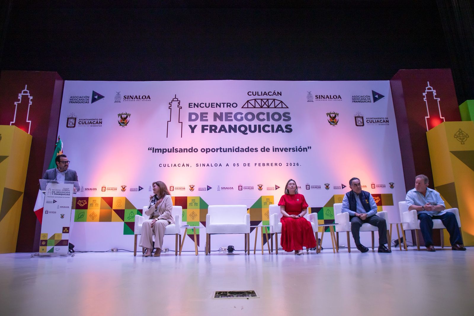 Previo a la ceremonia oficial, Juan de Dios Gámez cortó el listón inaugural del foro junto con la presidenta de la Asociación Mexicana de Franquicias, Betzabé Citlali Eslava Altamirano; el rector de la UAS, Jesús Madueña Molina; el empresario Marcus Dantus; así como las y los presidentes municipales de Mazatlán, Estrella Palacios; Ahome, Antonio Menéndez; El Fuerte, Gildardo Leyva; Rosario, Claudia Valdez; Escuinapa, Víctor Díaz; Sinaloa, Rolando Bojórquez; Juan José Ríos, Evangelina Llanes; Badiraguato, José Paz López; Elota, Richard Millán y Concordia, Óscar Zamudio, así como Enrique Parra de Mocorito.