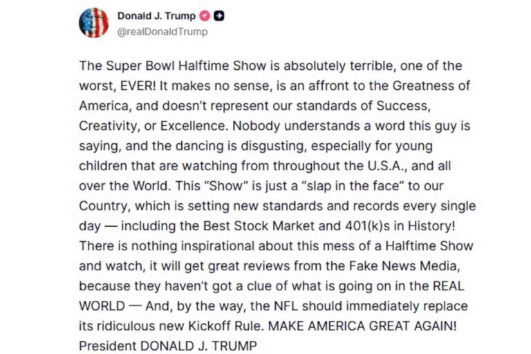“El espectáculo del descanso de la Super Bowl es absolutamente terrible, ¡uno de los peores de la historia! No tiene sentido, es una afrenta a la grandeza de Estados Unidos y no representa nuestros estándares de éxito, creatividad o excelencia“.