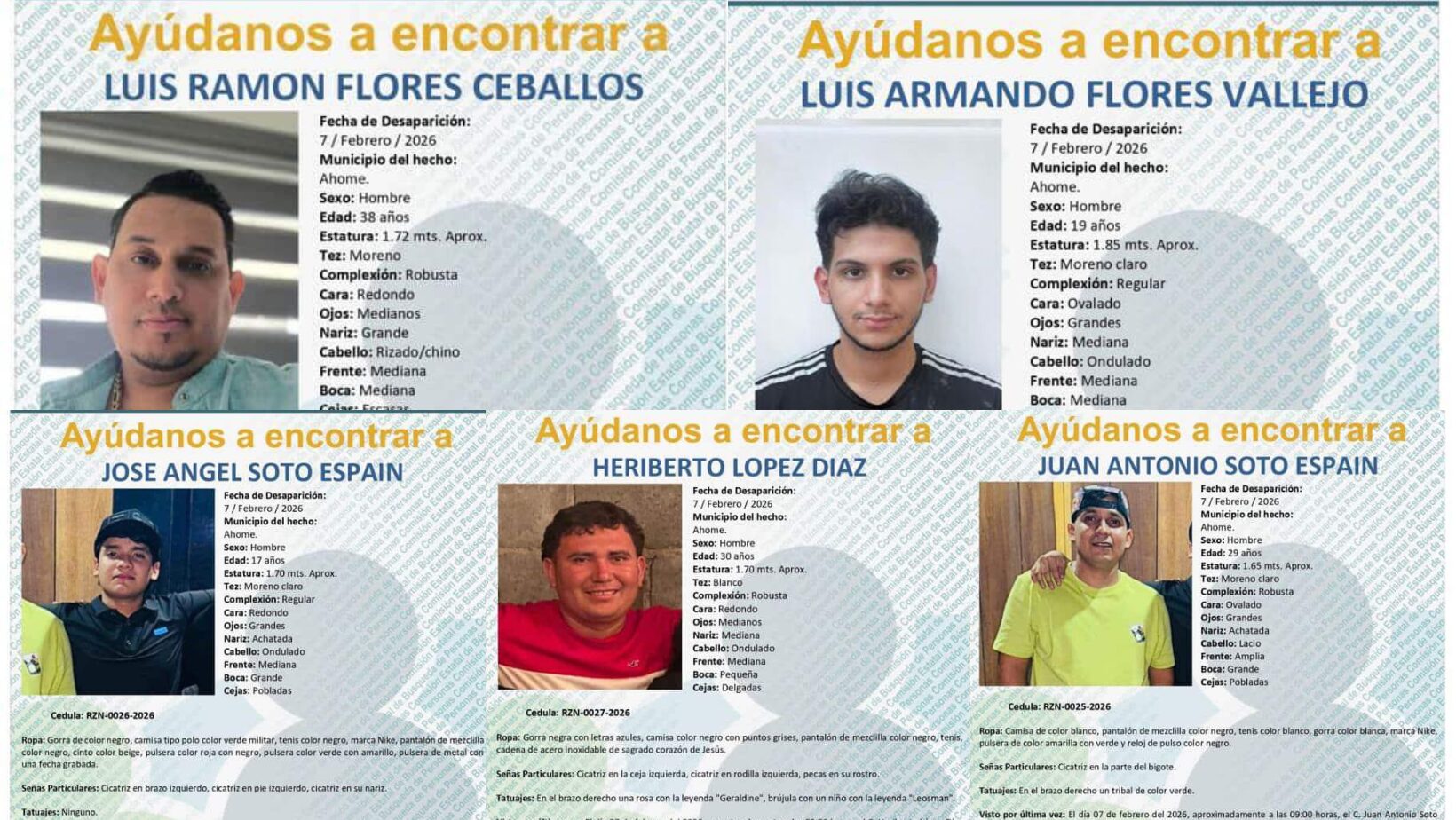 Se trata de José Ángel Soto Espain , Juan Antonio Soto Spain, Luis Armando Flores Vallejo, Luis Ramón Flores Cevallos y Heriberto López Díaz quienes fueron dejados dentro de la caja de una camioneta, debajo de una lona. Sin vida. Abandonados y con un olor a putrefacción que debió pasar por la carretera Los Mochis-Culiacán. Es decir, unos 230 kilómetros, por donde hay al menos dos paradas con elementos de la Fiscalía General de la República y el Ejército, y tres casetas de peaje.