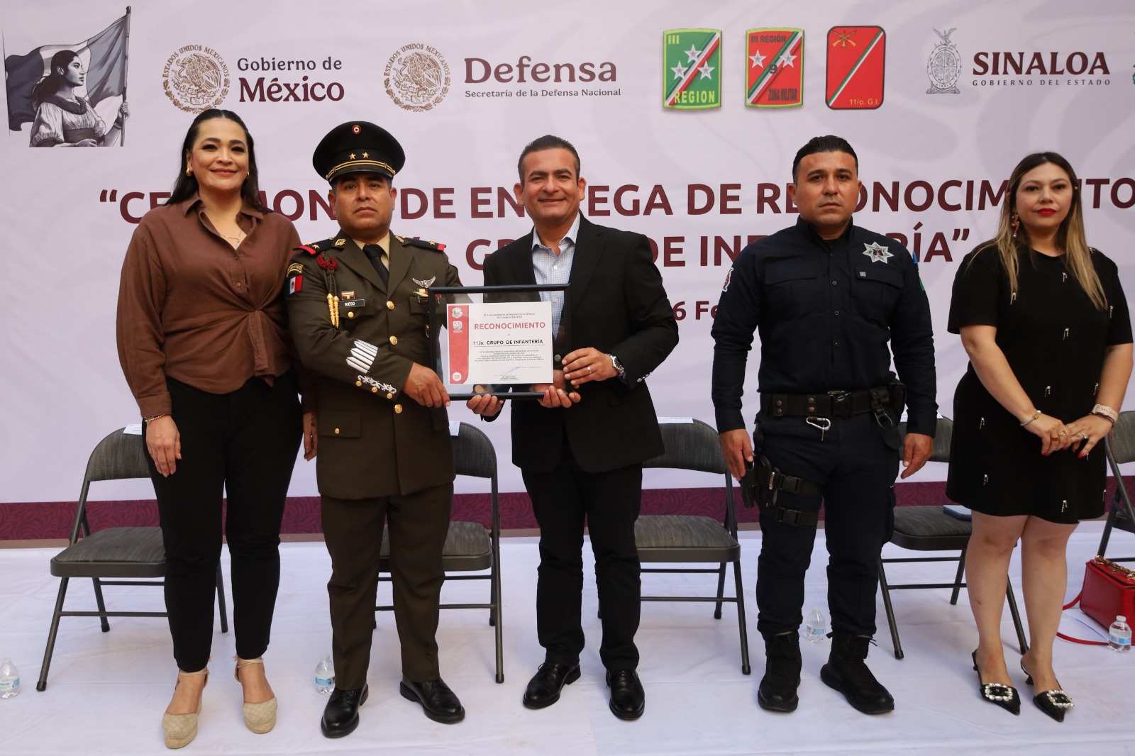 Navolato, Sin.- En el marco de la conmemoración de febrero, mes del Ejército y la Fuerza Aérea Mexicana, el Presidente Municipal de Navolato, Jorge Rosario Bojórquez Berrelleza, encabezó la ceremonia cívica de entrega de reconocimiento al 11/o Grupo de Infantería, destacando que la seguridad de las familias navolatenses es resultado de la coordinación permanente entre autoridades civiles y fuerzas armadas.