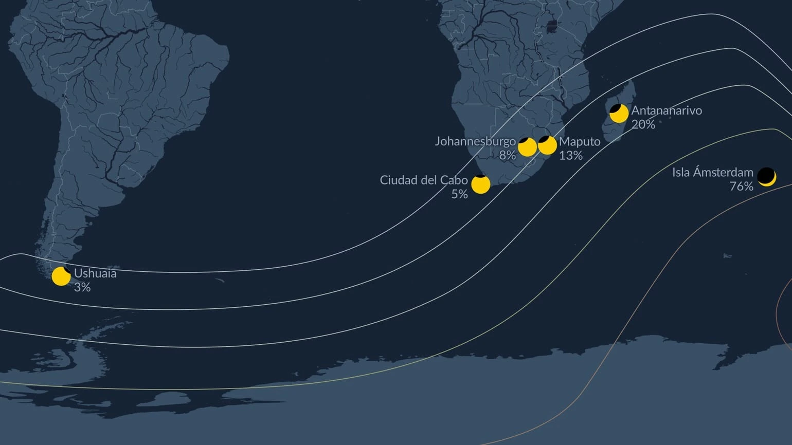 En América sólo fue visible de forma parcial, en una ciudad al extremo sur de Argentina llamada Ushuaia. En Chile hubo observaciones en Punta Arenas, mientras que en Sudáfrica se reportaron vistas parciales en Ciudad del Cabo.