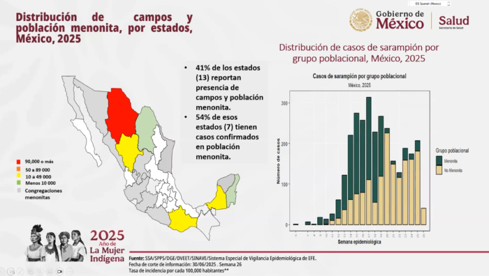 Hasta mayo de 2025, la mayor parte de los casos de sarampión en el país habían sido de población menonita. Ya en junio se habían registrado 8 muertes por sarampión, cuatro de personas menonitas y cuatro de habitantes indígenas, según un reporte de la Secretaría de Salud.