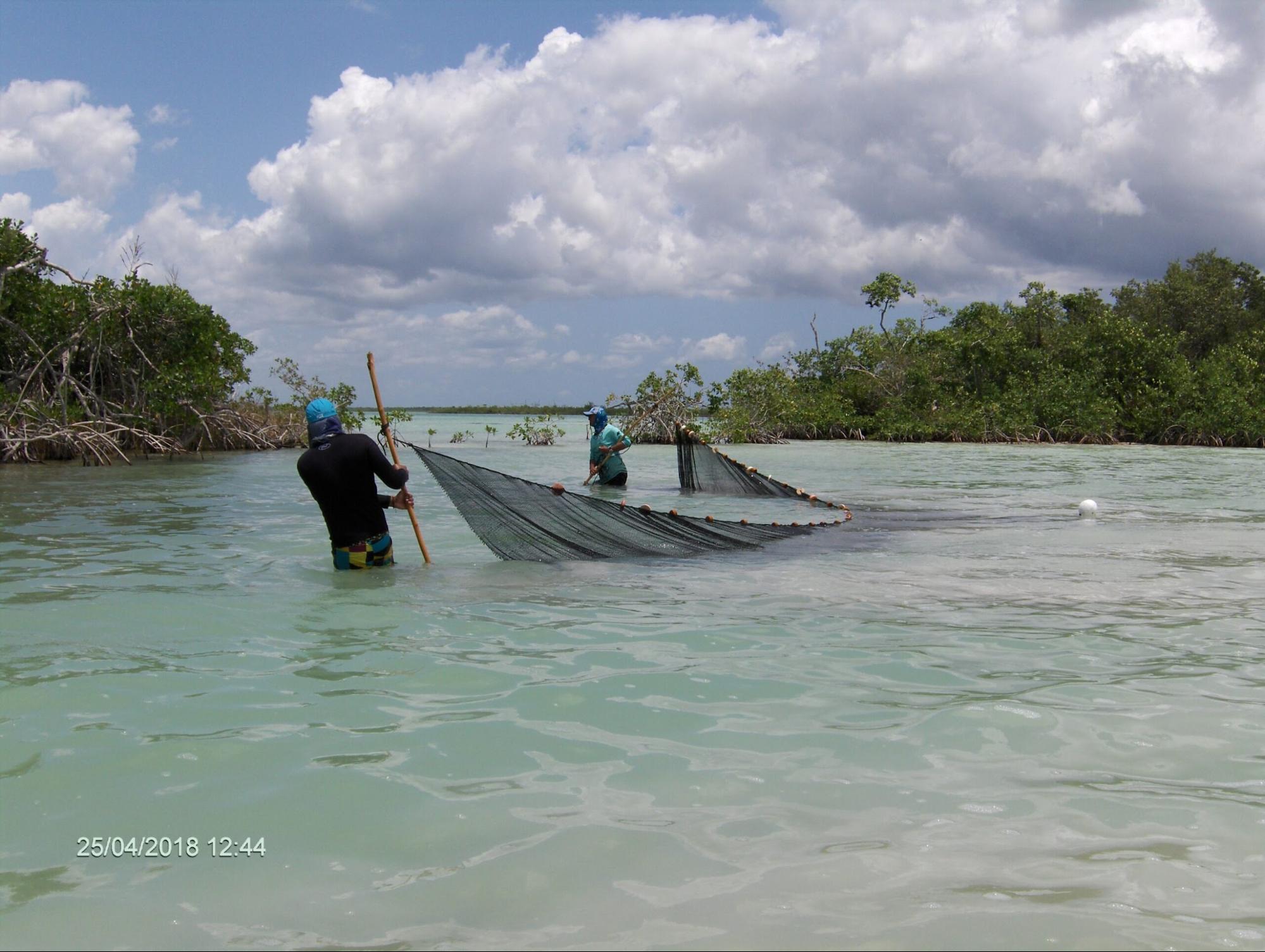Juan Jacobo Schmitter arrastrando un chinchorro playero en la bahía de Chetumal, Quintana Roo, en 2018. En la parte más interna (dulceacuícola) de la bahía hay pez diablo; en la parte más externa (marina), hay pez león (Pterois volitans). Foto: cortesía Addiel PéreZ.