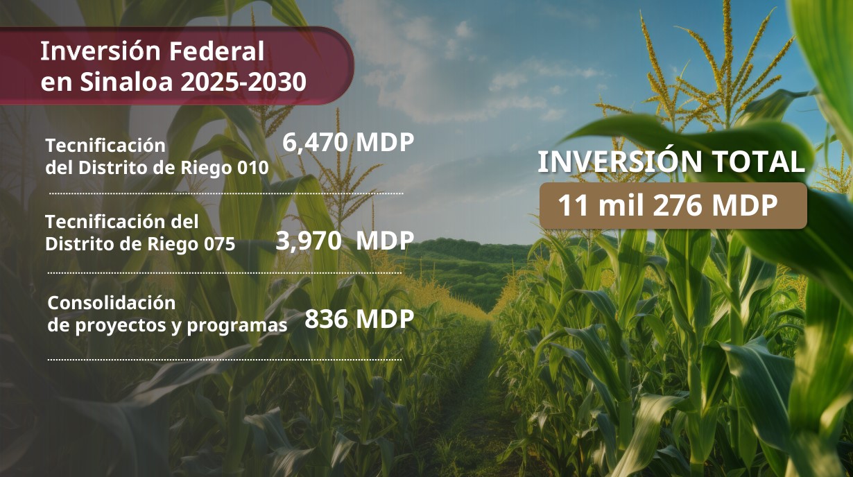 El documento señala que la inversión federal en Sinaloa para el periodo 2025-2030 asciende a 11 mil 276 millones de pesos, destinados a la tecnificación de los distritos de riego 010 y 075, así como a la consolidación de proyectos y programas estratégicos.