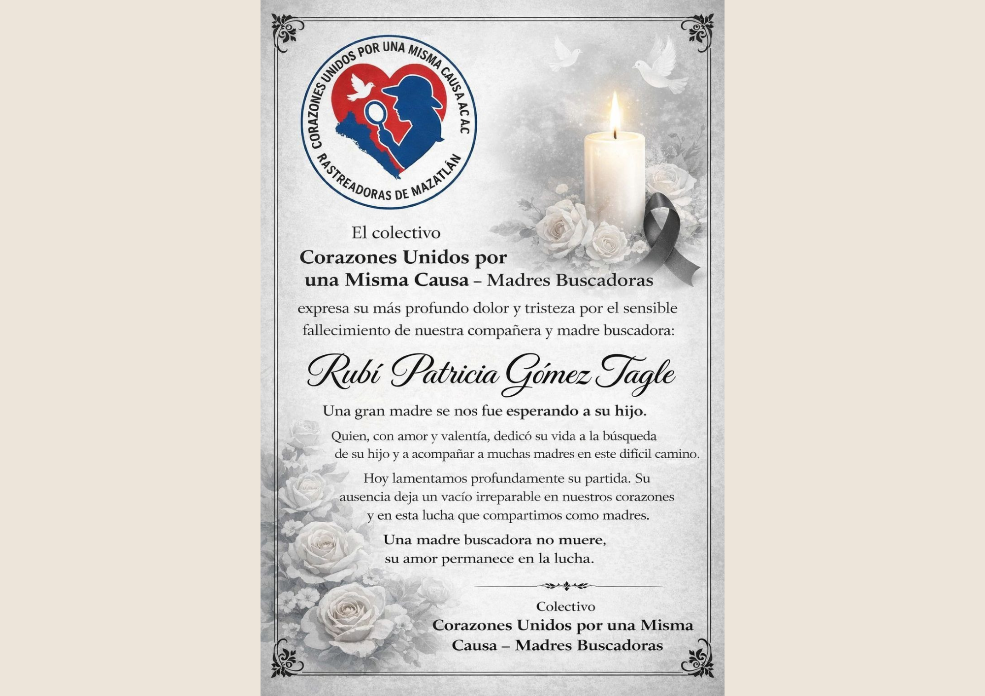 Mazatlán, Sinaloa.- La mañana del viernes 27 de febrero fue localizada sin vida Rubí Patricia Gómez-Tagle, de 38 años, integrante del colectivo Corazones Unidos por una Misma Causa en Mazatlán.