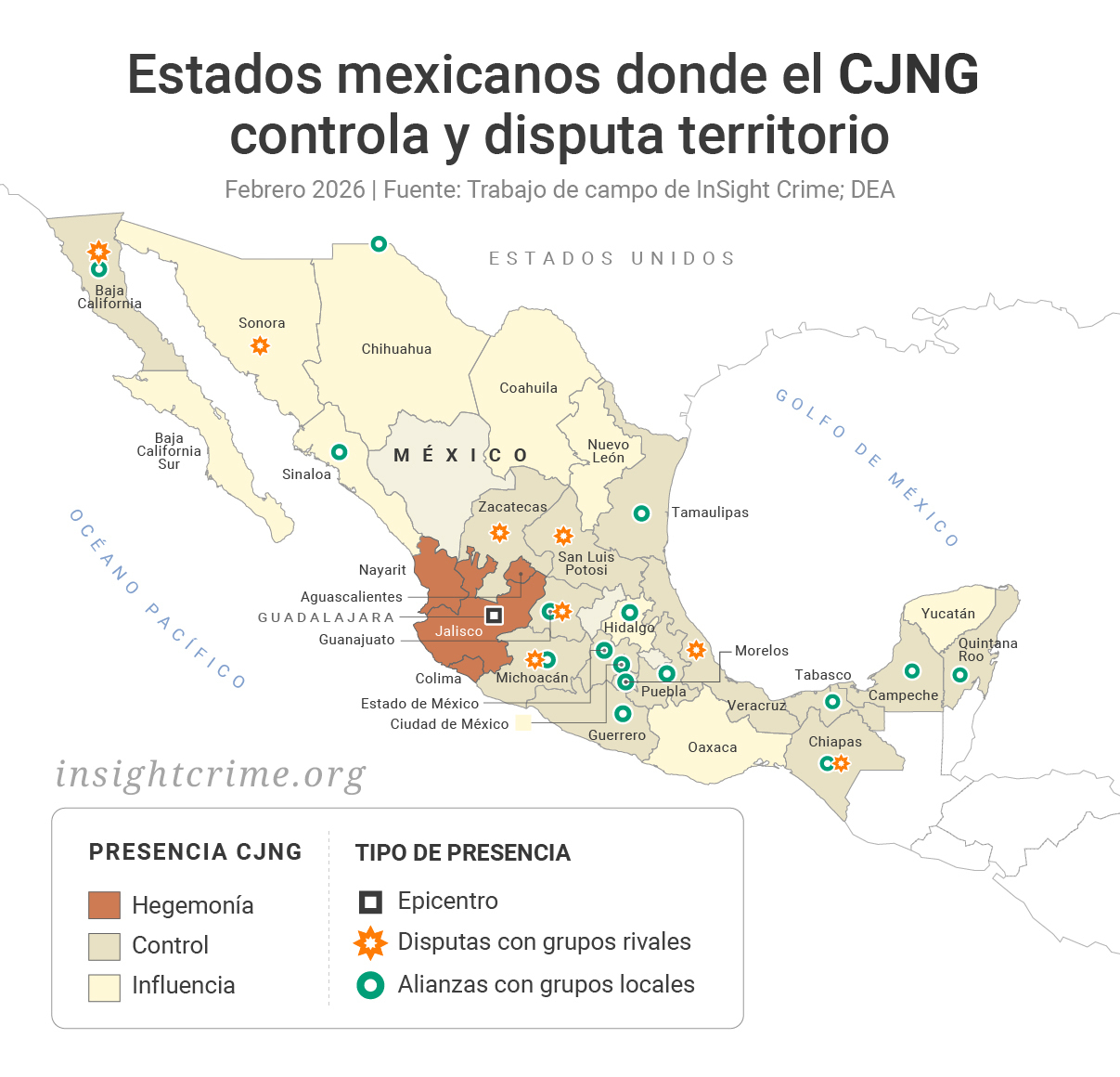 El CJNG ha establecido una presencia permanente en este estado fronterizo de México y Estados Unidos, alineándose con facciones disidentes del Cartel de Tijuana para acceder a corredores clave de contrabando. El grupo ha intentado desplazar a células del Cartel de Sinaloa y ha atacado directamente a las fuerzas de seguridad locales. Aún está por verse si una reciente alianza establecida con la facción de los Chapitos del Cartel de Sinaloa se desmoronará o ayudará al CJNG a mantener el control de esta codiciada región.