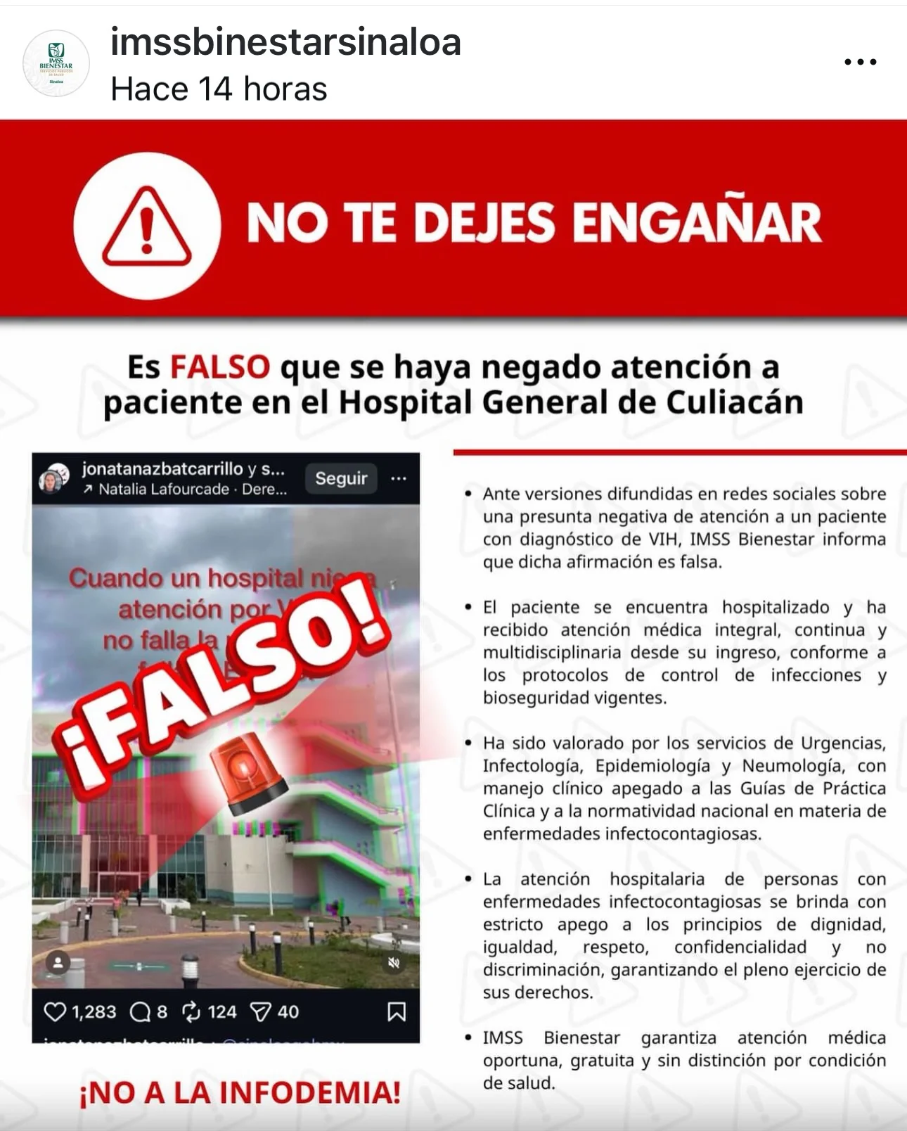 Además de describir como preocupante el hecho una institución pública, como lo es el IMSS Bienestar, haya utilizado su nombre, desmentido una denuncia y adjudicándola a la narrativa de la infodemia, termino que se utilizar para referirse a la sobreabundancia de información, ya sea verdadera o falsa, que circula rápidamente y dificulta encontrar fuentes y orientación confiables.