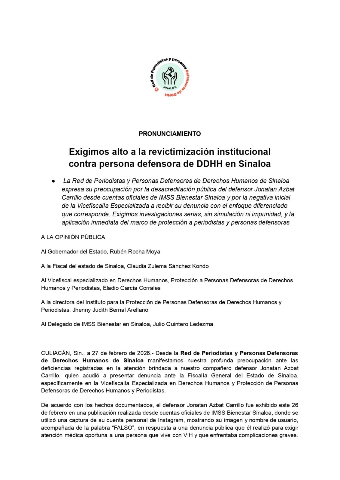 La Red de Periodistas y Personas Defensoras de Derechos Humanos de Sinaloa emitió un pronunciamiento para denunciar la revictimización institucional contra el defensor Jonatan Azbat Carrillo, tras una serie de hechos que levantan la preocupación respecto al contexto actual de la protección de las y los defensores de los derechos humanos.