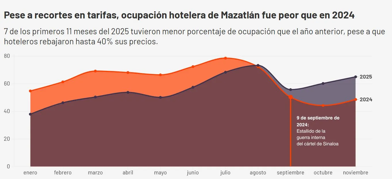 “A este año llegamos, como quien dice, en modo supervivencia. […] De seguir en este ciclo, será un reto enorme para muchos continuar durante el 2026, sobre todo los nuevos que siguen apalancados [o endeudados]”, dijo a ESPEJO el director de ventas de uno de los hoteles de cadena más grandes de Mazatlán. Prefirió permanecer anónimo para evitar alguna confrontación gubernamental o censura.