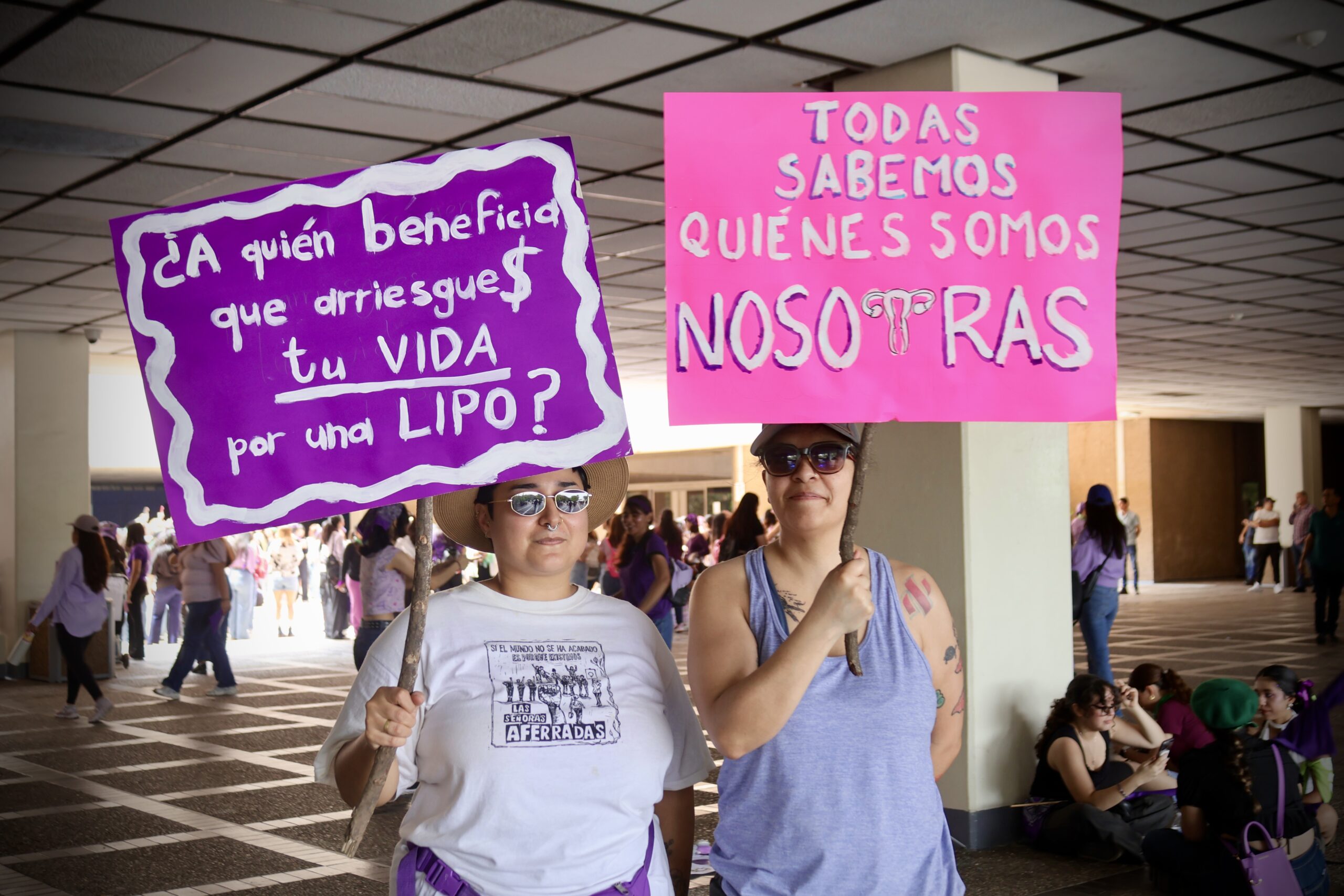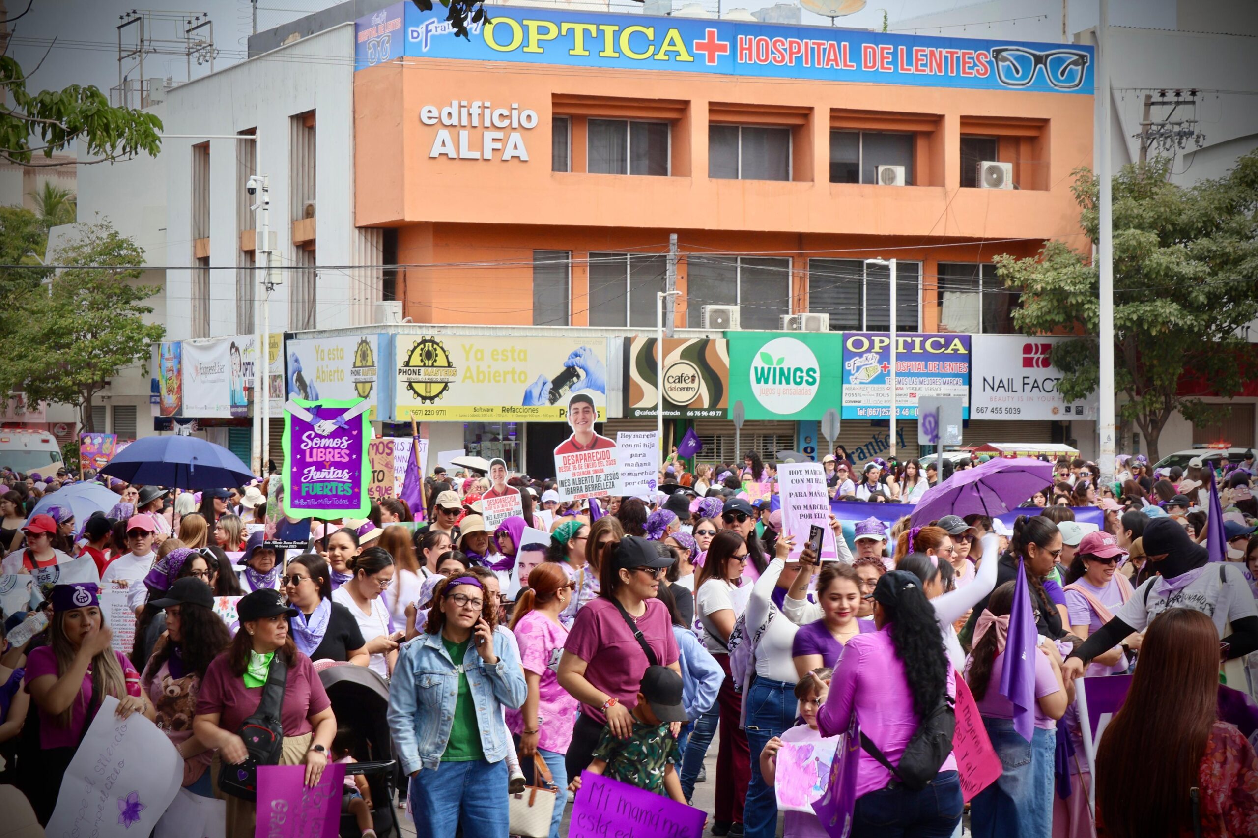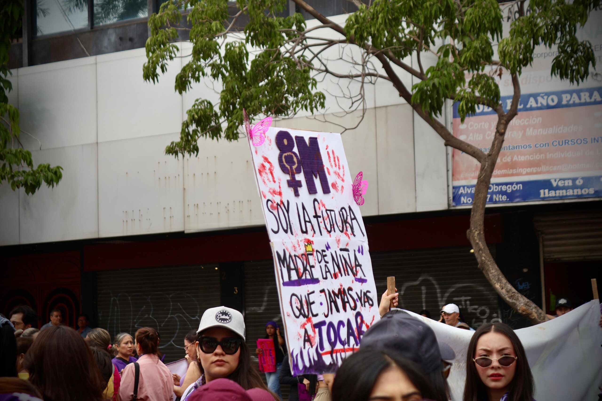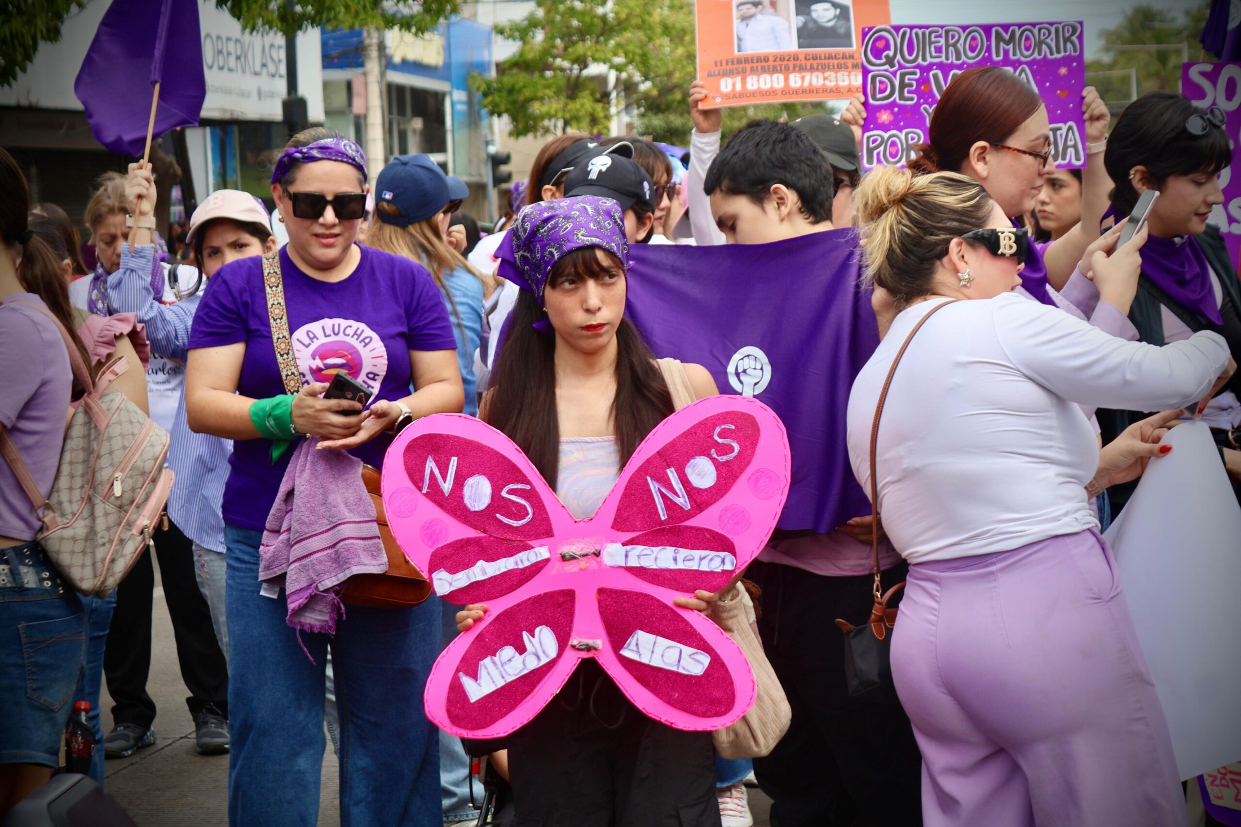 Culiacán, Sin.- Los carteles se veían desde lejos. Frente al Ayuntamiento de Culiacán, la avenida Álvaro Obregón comenzó a teñirse de morado. Había rabia, pero también abrazos, risas nerviosas y miradas cómplices. Un humo de limpia, de protección para el camino, comenzaba a envolver a las asistentes.