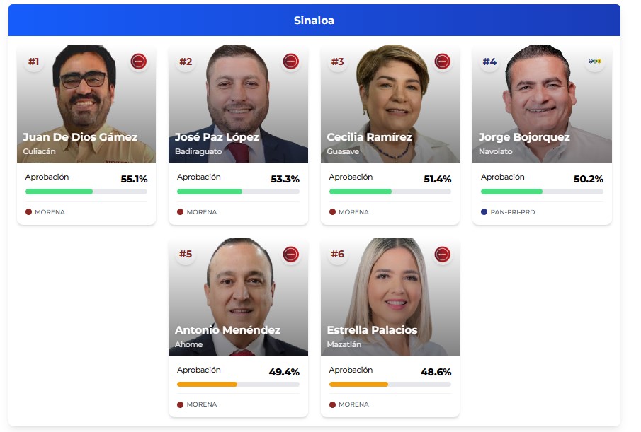 José Paz López, alcalde de Badiraguato, aparece en segundo lugar con el 53.3 por ciento de aprobación; Cecilia Ramírez, alcaldesa de Guasave, en tercer lugar, con el 51.4 por ciento de aprobación; Jorge Bojórquez, alcalde de Navolato, en cuarto lugar, con el 50.2 por ciento de aprobación.