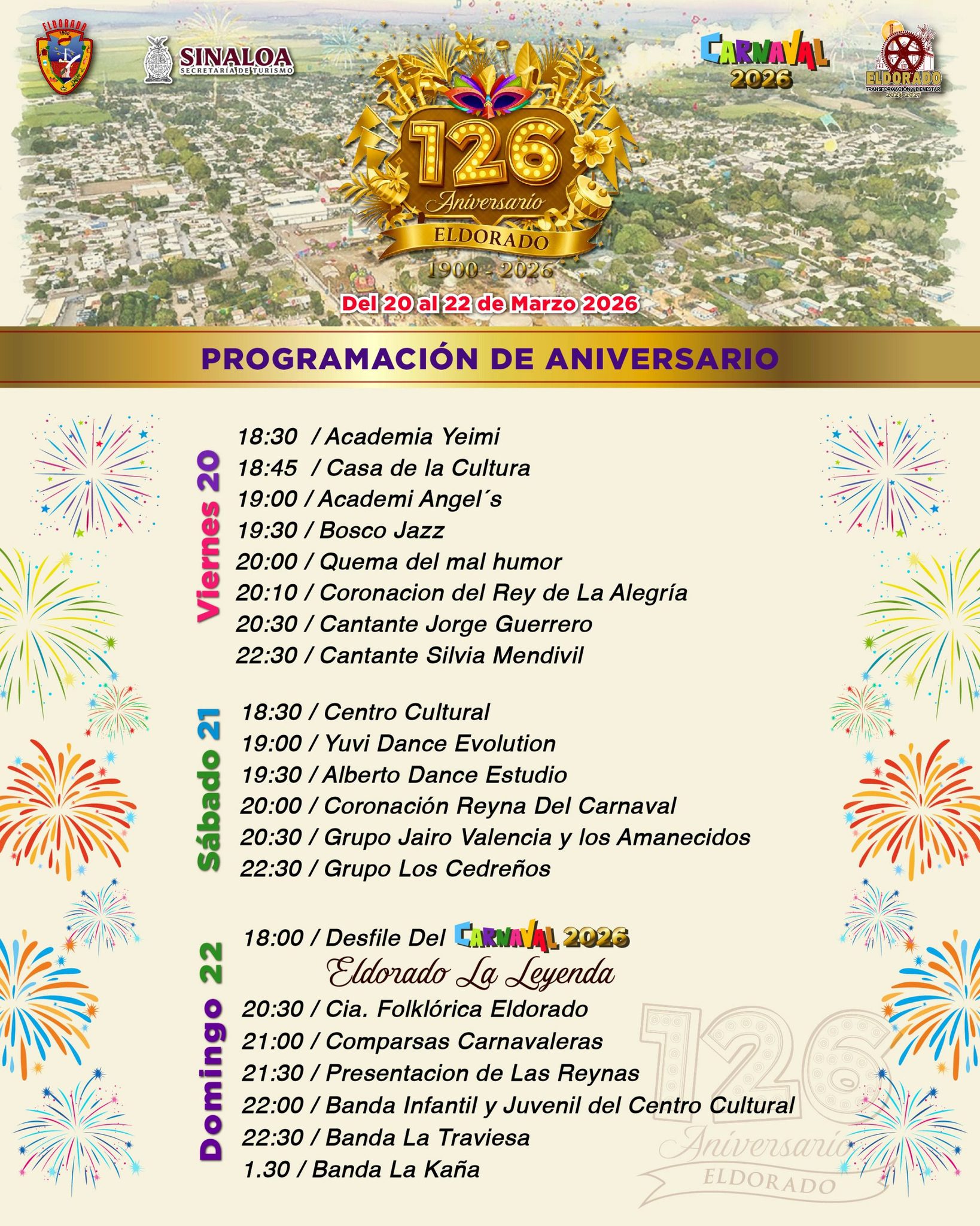 El desfile del Carnaval 2026 se llevará a cabo el próximo domingo 22 de marzo, en punto de las 18:00 horas, sin embargo, la programación comenzará desde el viernes 20 con la presentación de Academia Yeimi, a las 18:30 horas.