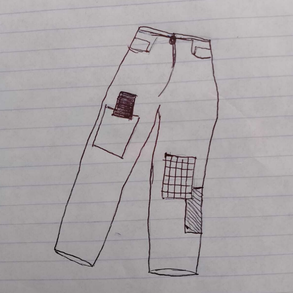 Fabiola Madrigal dibujó los pantalones que llevaba su hija Carolina cuando desapareció, que había decorado con parches. (Cortesía)