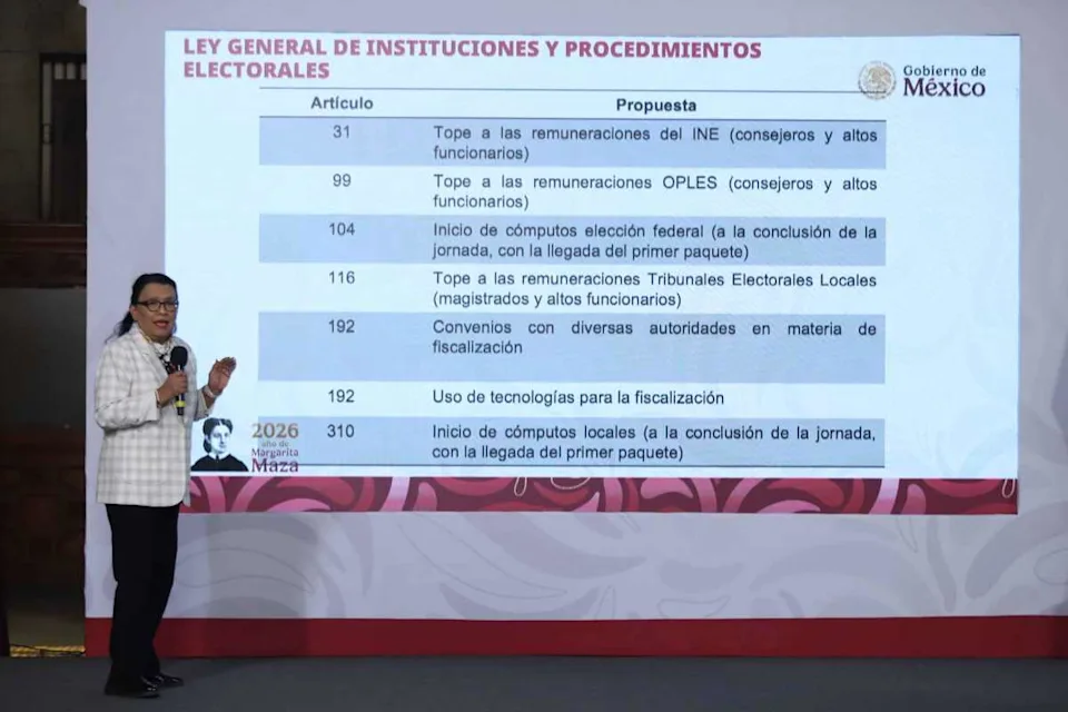 La secretaria de Gobernación, Rosa Icela Rodríguez, presentó los puntos principales de la propuesta de Plan B que será enviada al Senado, tras el rechazo de la reforma electoral.