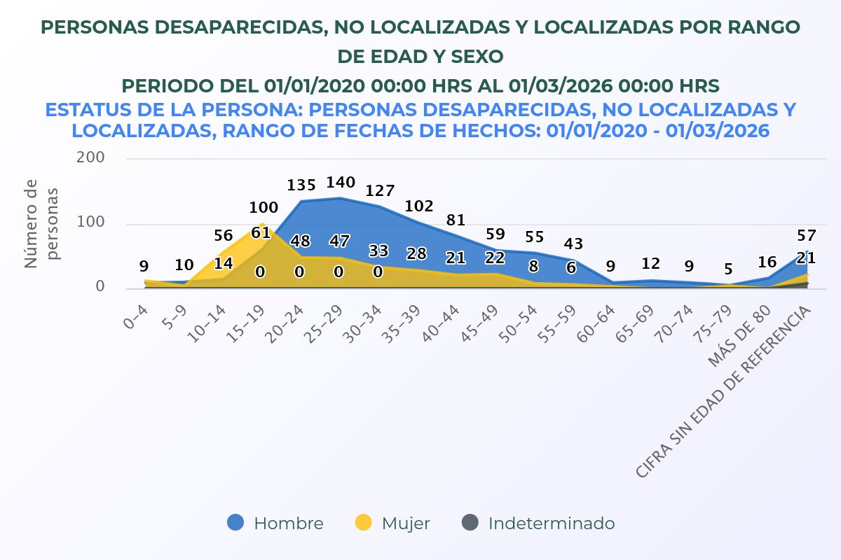 Por edades, la mayor parte de las mujeres desaparecidas en dicho periodo de tiempo el grupo etario de 15 a 19 años es el que más desapariciones acumula con 61 casos; después le sigue el de 10 a 14 años, con 56 casos; luego de 20 a 24 años, con 48 y de 25 a 29 años, con 47 casos, según el Registro Nacional de Personas Desaparecidas, No Localizadas y Localizadas.