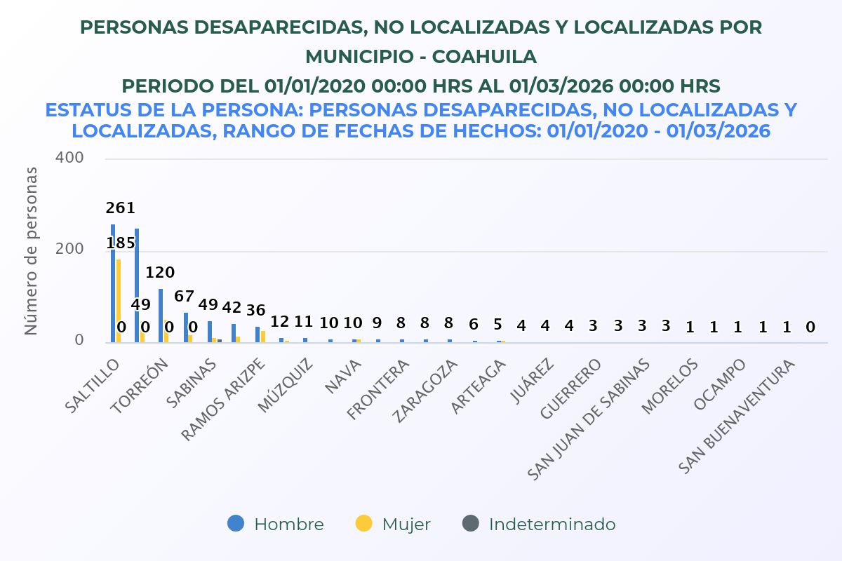 Desde el 1 de enero del 2020 al 3 de marzo del 2026, en el estado de Coahuila se tiene el reporte de 413 mujeres desaparecidas contra 944 hombres, de acuerdo con el Registro Nacional de Personas Desaparecidas, No Localizadas y Localizadas (RNPDNO).