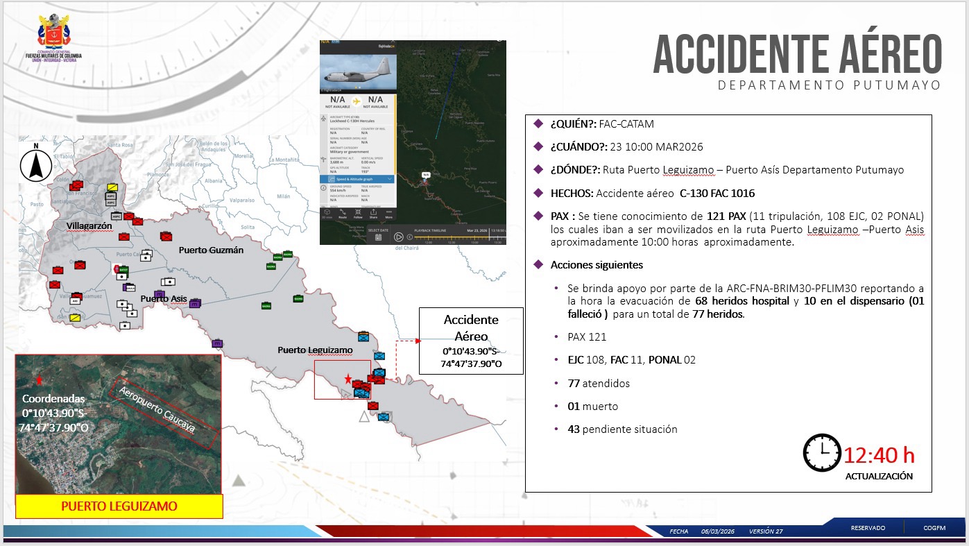 La aeronave Hércules se estrelló poco después de despegar de Puerto Leguízamo, cerca de la frontera con Ecuador, por causas que aún se desconocen. Los equipos de rescate están desplegados en la zona.