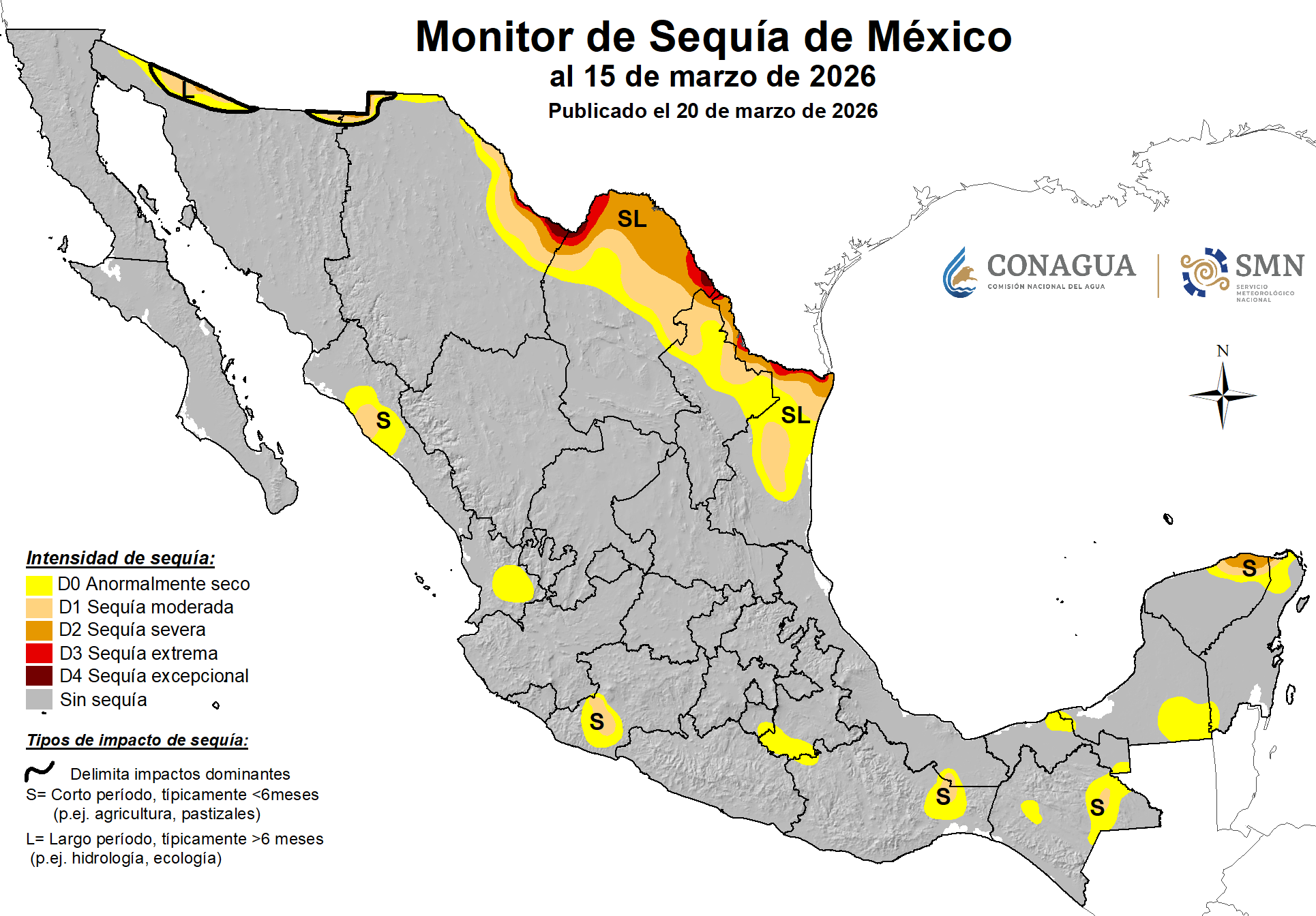 Sin embargo, también se reportó un incremento de áreas con condiciones anormalmente secas en distintas regiones del país, lo que mantiene el monitoreo activo sobre la evolución de la sequía, sobre todo en los estados del Norte de México, en las zonas que colindan con el Río Bravo.