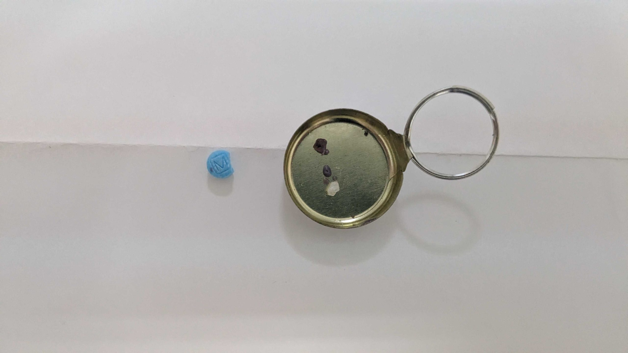 Muestra de una pastilla M30 y heroína de goma negra posiblemente mezclada con fentanilo en una ciudad de la frontera norte de México. Crédito: InSight Crime, 2025.