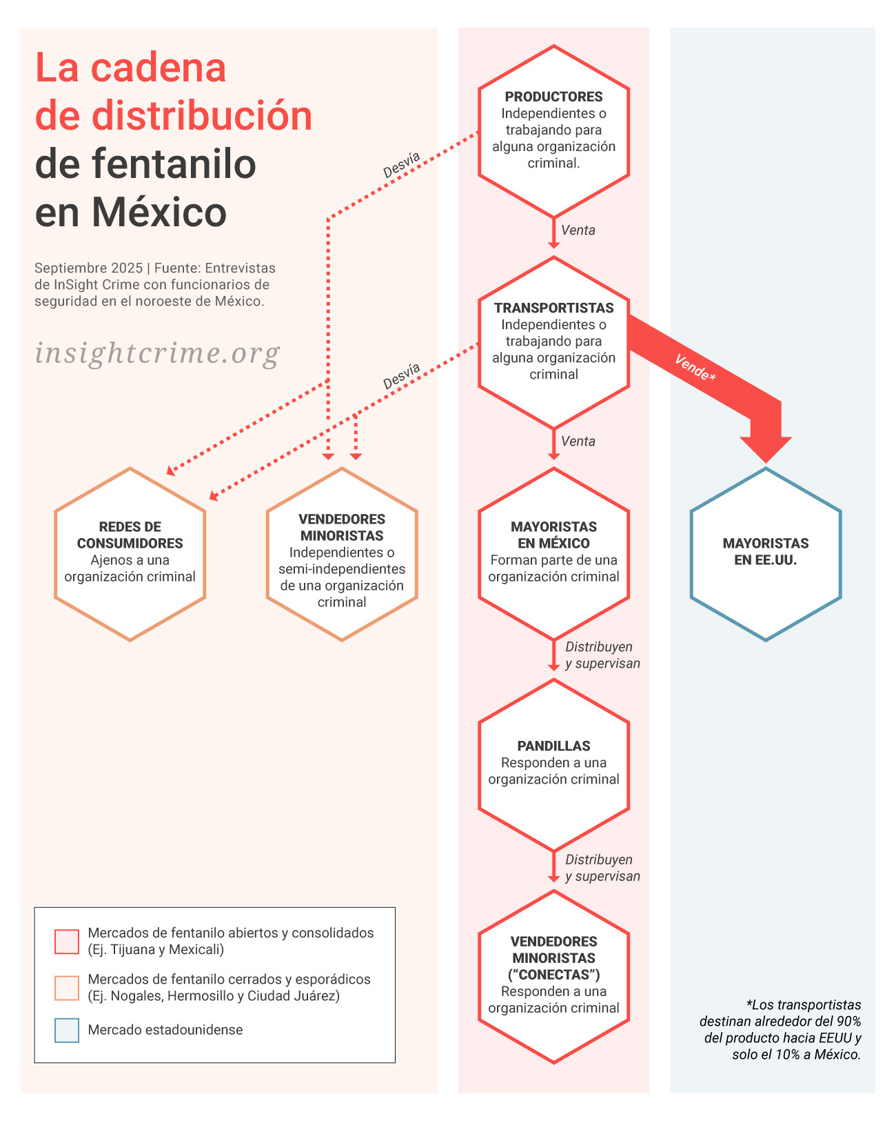 Ambas facciones restringen la venta local de fentanilo y, según diversas fuentes, incluso han llegado a matar o desaparecer a distribuidores que desafían estas reglas. Aun así, el fentanilo ha logrado entrar al mercado local a través de actores vinculados a redes internacionales de tráfico que utilizan el cruce de Nogales. Sin embargo, deben operar de forma clandestina y mantener redes cerradas con consumidores de confianza en barrios específicos. Por ello, el consumo de fentanilo ocurre principalmente en espacios privados, lejos de los puntos de venta donde se comercializan otras drogas.