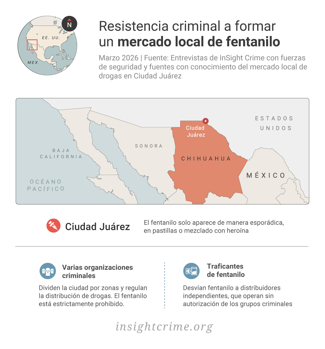 En la práctica, la presencia de fentanilo en Ciudad Juárez sigue siendo esporádica y su distribución se mantiene clandestina, pese a que la ciudad es un importante punto de tráfico para cargamentos destinados a Estados Unidos. Solo un número reducido de vendedores vinculados a redes internacionales de narcotráfico lo ofrece a nivel local, generalmente en pastillas M30 o mezclado con otras sustancias.