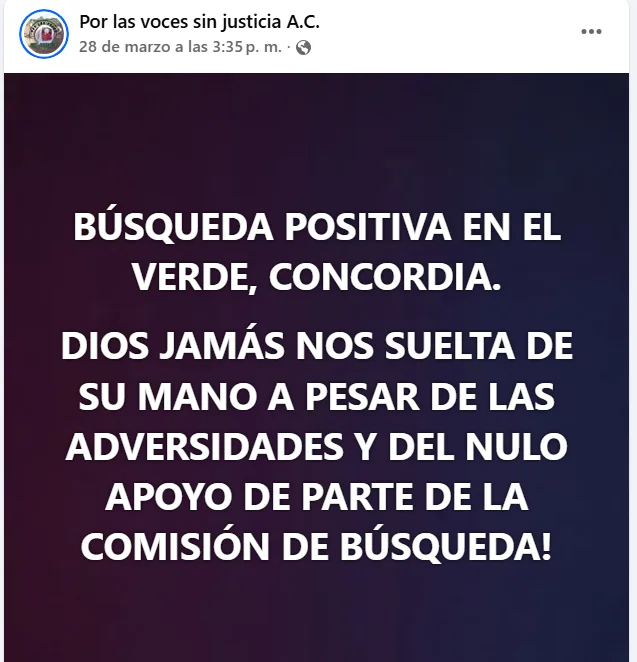 Mazatlán, Sinaloa.- El colectivo Por las Voces Sin Justicia denunció en redes sociales la falta de apoyo de la Comisión Estatal de Búsqueda de Personas de Sinaloa, al asegurar que han tenido que salir a buscar por su cuenta y con recursos propios, incluso en zonas de riesgo donde se han logrado hallazgos.