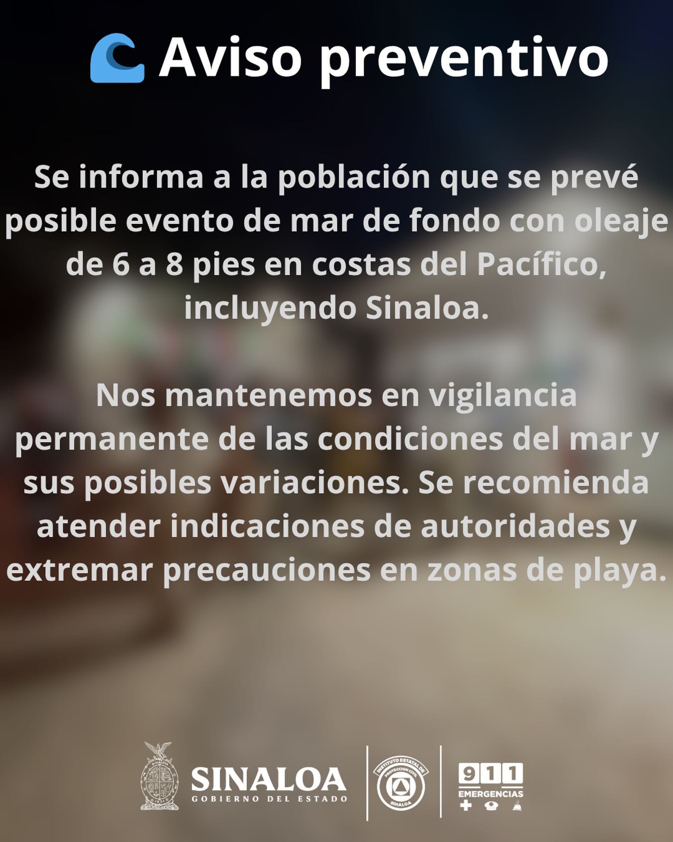 “Se informa a la población que se prevé posible evento de mar de fondo con oleaje de 6 a 8 pies en costas del Pacífico, incluyendo Sinaloa”, se puede leer en el aviso de Protección Civil.