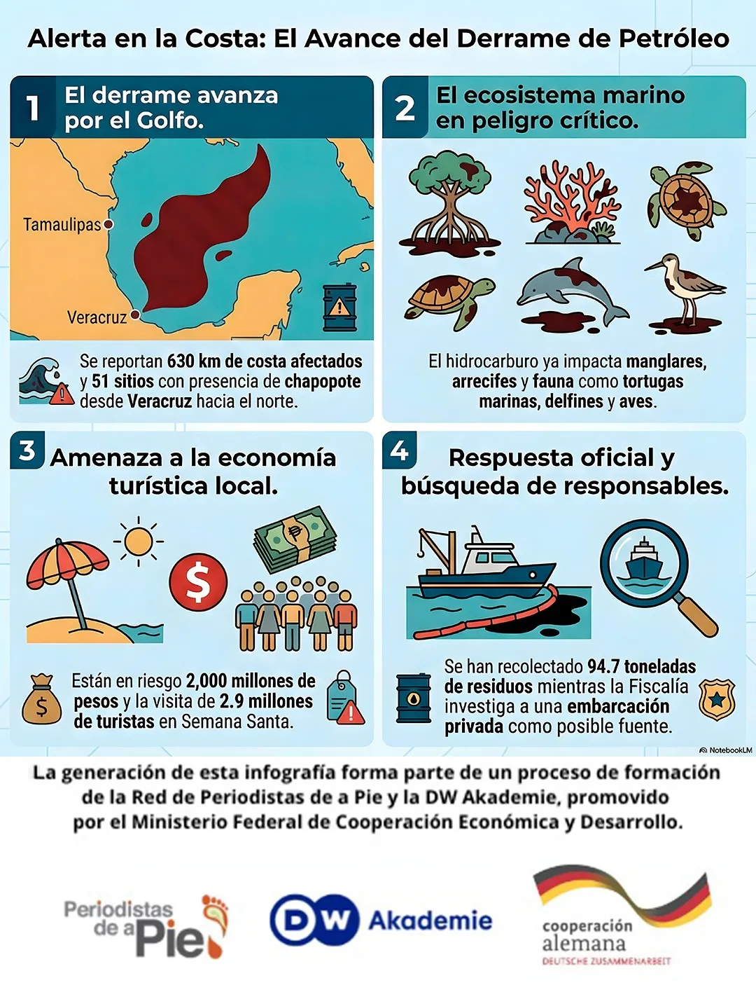 El Gobierno de México sostiene que el operativo de limpieza avanza. El 19 de marzo informó que se habían recolectado 94.7 toneladas de residuos impregnados con hidrocarburo y que las labores registraban un avance de 88%. Indicó además que continúan recorridos de verificación, monitoreo satelital y análisis de corrientes marinas para “identificar la posible fuente del contaminante”.