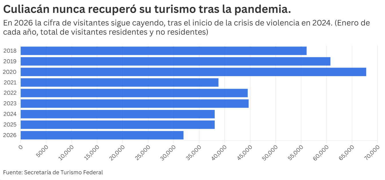 En enero de 2026, último mes con información disponible, Culiacán recibió 31,934 visitantes nacionales y extranjeros, una caída de 16.1% respecto a los 38,057 registrados en el mismo mes de 2025. La disminución equivale a 6,123 visitantes menos y ocurre en medio de la crisis de seguridad que atraviesa Sinaloa, con la capital del estado como principal epicentro de la violencia.