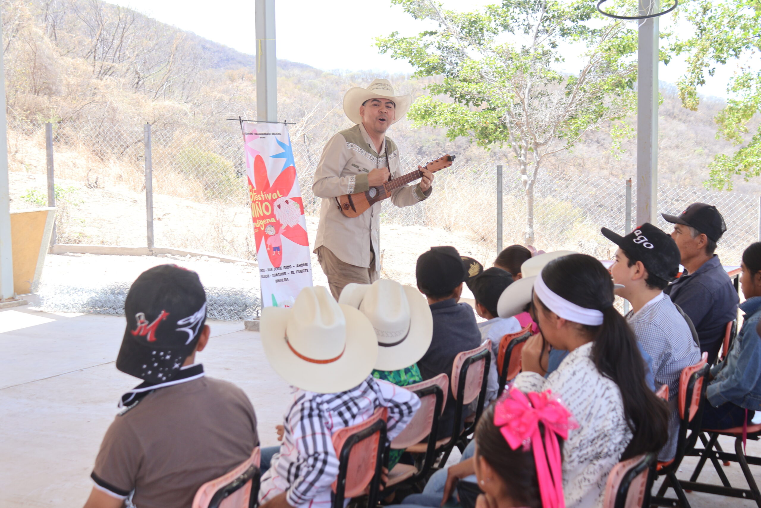El primer artista que se presentó fue Óscar Rockmero, un artista del municipio de Ahome. Cantó frente a los niños, todos sentados de manera ordenada en sillas que habían sacado del salón de clases.